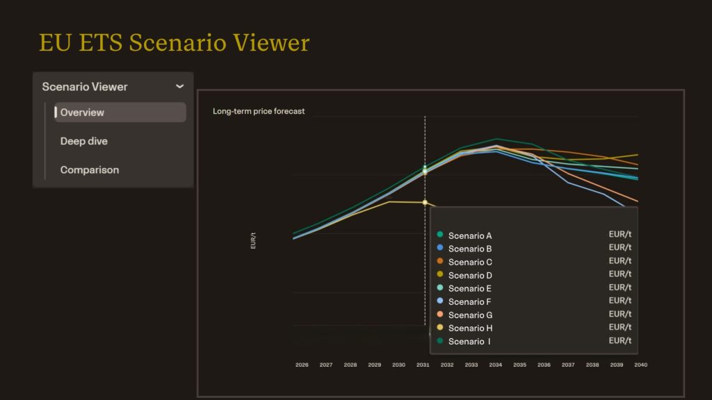 Beyond these pre-defined scenarios — which are updated dynamically as the debate in Brussels evolves — Veyt also provides ongoing policy updates and custom modelling for specified parameter combinations relevant to the ETS review process, helping clients assess the specific effects of potential policy shifts or price sensitivities on their unique portfolios.